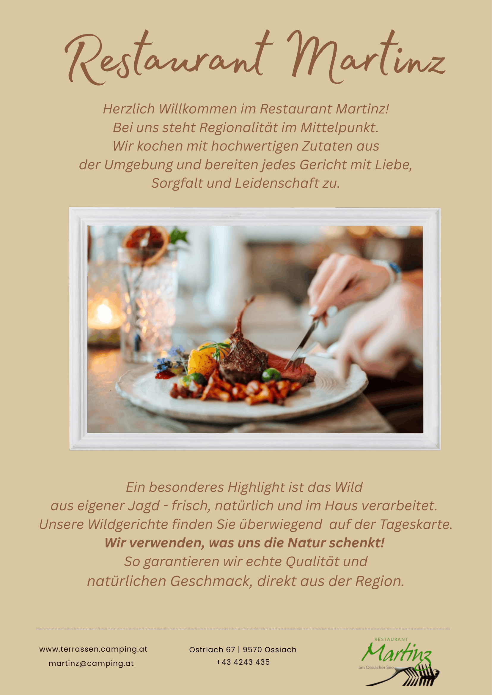 We source our organic beef from Carinthian farmers in the Mölltal valley, among others. We are particularly proud that our game specialties are sourced entirely by our chef Bruno and junior chef Johanna, who actively hunt themselves—it doesn’t get much more regional than that.